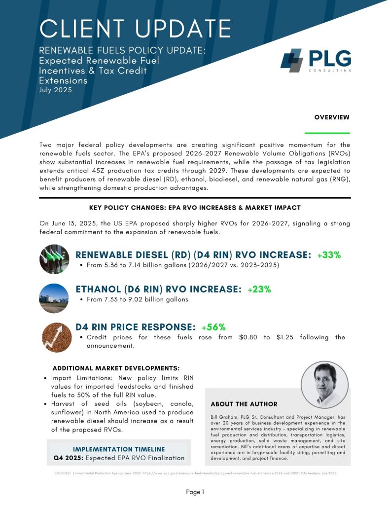 PLG Senior Consultant and Project Manager Bill Graham provides a comprehensive update on two major federal policy developments, creating significant positive momentum for the renewable fuels sector. The EPA’s proposed 2026-2027 Renewable Volume Obligations (RVOs) indicate substantial increases in renewable fuel requirements, with renewable diesel mandates rising 33% and ethanol requirements increasing 23%. Additionally, the passage of the Big Beautiful Tax Bill extends critical 45Z production tax credits through 2029, providing crucial long-term investment certainty.