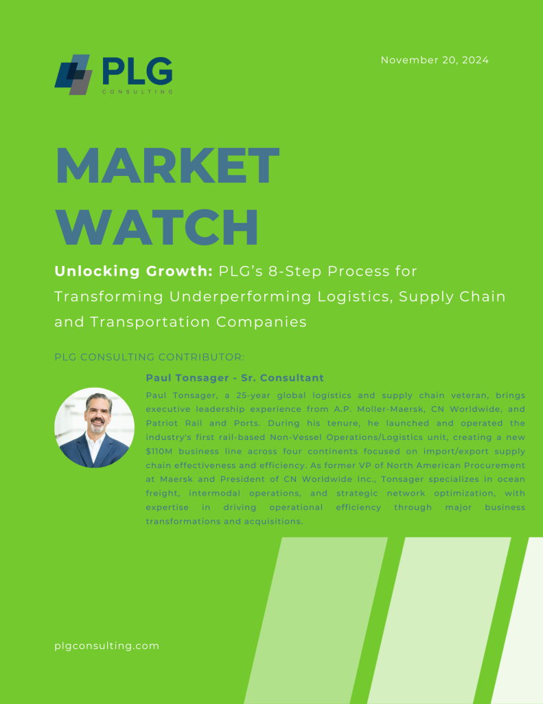 PLG Consulting’s Paul Tonsager offers sage advice for underperforming logistics, supply chain and transportation companies on how to accelerate transformation. This new Market Watch entitled “Unlocking Growth: PLG’s 8-Step Process for Transforming Underperforming Logistics, Supply Chain and Transportation Companies” provides a roadmap for strategic restructuring and optimization to gain a decisive edge.