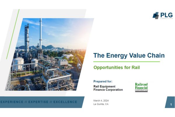 PLG Consulting's CEO, Graham Brisben, presents The Energy Value Chain at the 2024 Rail Equipment Finance conference. Download this free presentation detailing an energy overview, fossil fuels, decarbonization, and their opportunities for rail transportation.