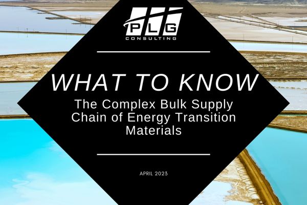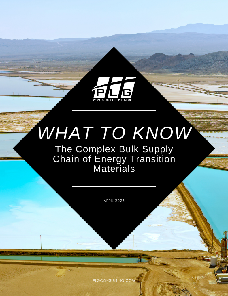 PLG Consulting publishes the 5th edition of the popular “What To Know” series entitled, “The Complex Bulk Supply Chain of Energy Transition Materials”. The report shares insights into the evolving and complex bulk supply chain that supports energy transition materials (ETM). The energy transition materials (ETM) bulk supply chain refers to the process of sourcing, transporting, and distributing energy transition minerals, metals, their reagents, and the co-products on a large scale. ETMs are critical components in the transition to clean and renewable energy, including battery metals (such as lithium, cobalt, & nickel), rare earth elements, and solar materials. The bulk supply chain of these materials is complex and involves multiple players, including mining companies, refineries, manufacturers, distributors, and recyclers.