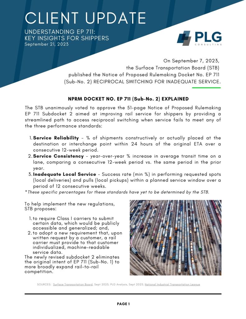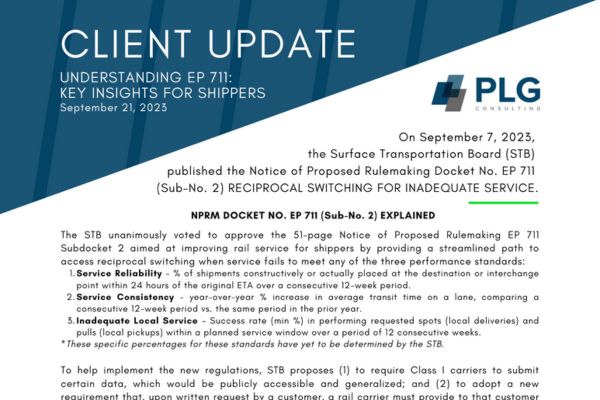 PLG Consulting explains the recent published Notice of Proposed Rulemaking Docket EP 711 (No. 2) by the Surface Transportation Board. The ruling aims at improving rail service for shippers by providing a streamlined path to access reciprocal switching when service fails to meet specified performance standards. In this 1-page client update, PLG rail consultants provide the following insights:
